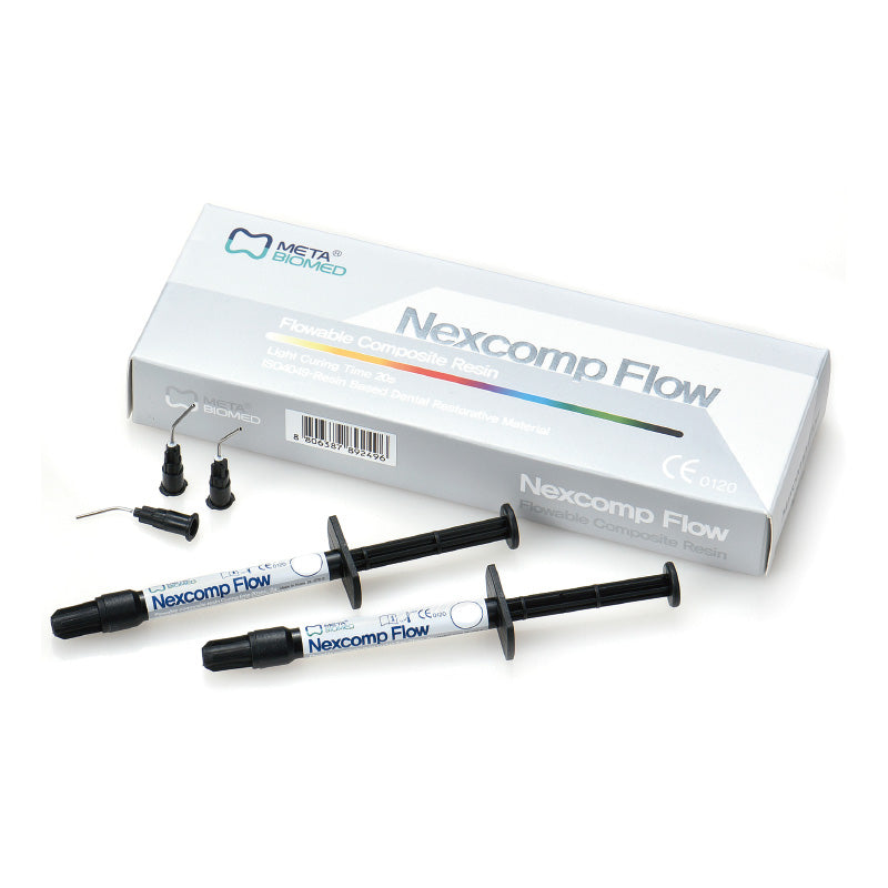 Nexcomp Flow resina fluida, con excelentes propiedades de manipulacion y esteticas, para uso en distintas aplicaciones restauradoras del sector anterior y posterior. Disponible en empaques de 2 jeringas de 2gr cada una.