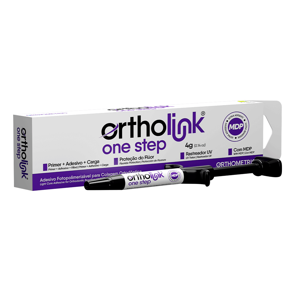 Ortholink One Step es autoadhesivo sobre esmalte o dentina previamente acondicionado, ya que en su formulación se combinan el primer, el adhesivo y los rellenos, eliminando así la necesidad de adhesivo dental, brindando facilidad clínica al profesional. El material fue sometido a pruebas de resistencia al corte de la estructura dental, por parte de importantes universidades, en los tres tipos de brackets. Los resultados confirman el uso del material Ortholink One Step sin adhesivo dental ya que presentó resultados superiores a sus competidores