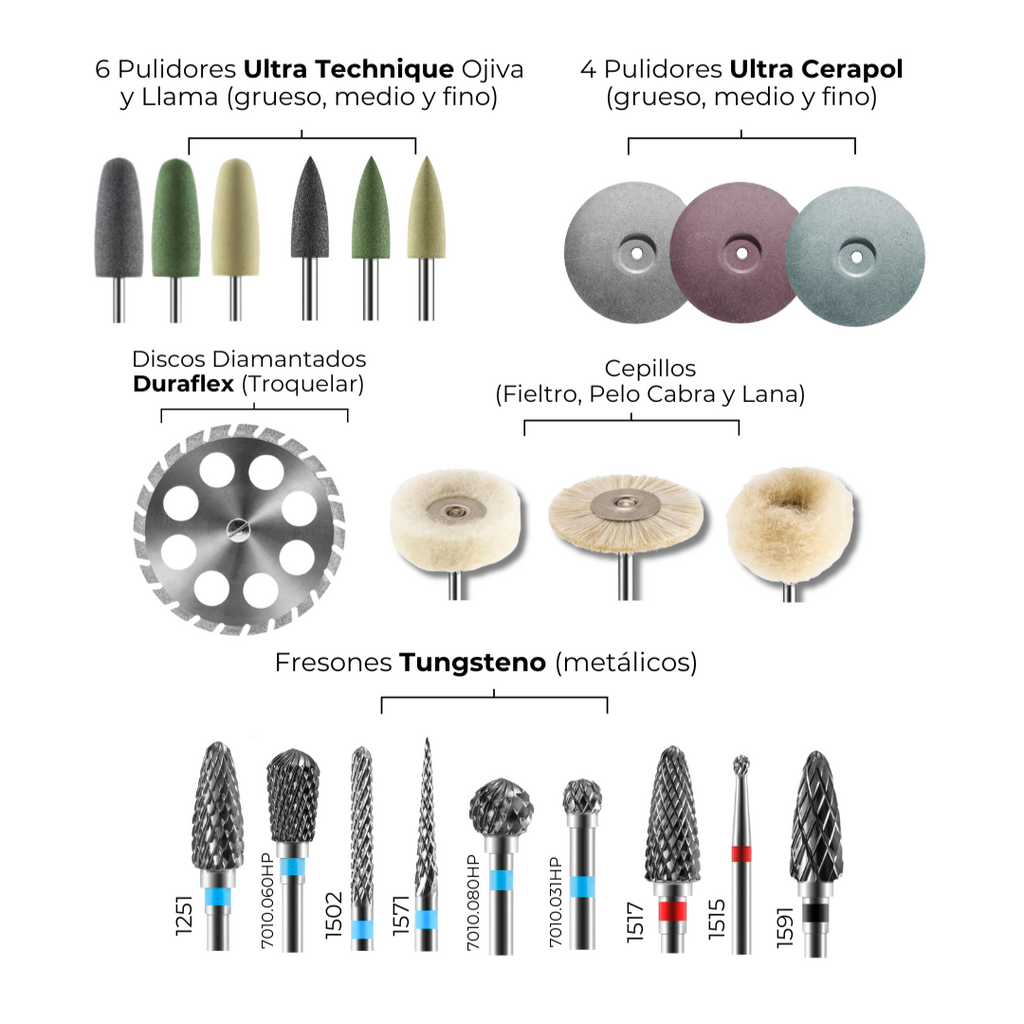 Kit Laboratorial Postgrado American Burrs® Selección diseñada específicamente por la dirección del Post-grado de Rehabilitación, para el trabajo de preparación y terminación de protesis dentales del programa de especialidad de dicha institución. Lo mejor del portafolio American Burrs® Lab Soluciones para corte, desgaste, preparación, pulido y brillo final en metal y acrílico, con las líneas Ultra-Technique®, Tungsten K20, Ultra-Metal®, Ulrta-Brush® y Duraflex®