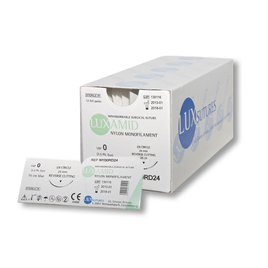 LUXSUTURES, especialistas en manufactura de suturas para cirugía. Localizada en Luxemburgo, en el corazon de Europa, entre Belgica, Alemania y Francia, reconocida a nivel mundial, goza de una gran aceptacion en el mercado internacional gracias a sus altos estandares de calidad, basados en las más exigentes regulaciones de sanidad y seguridad. Nylon no re-absorbible, disponible en diferentes calibres, caja con 12 sobres.