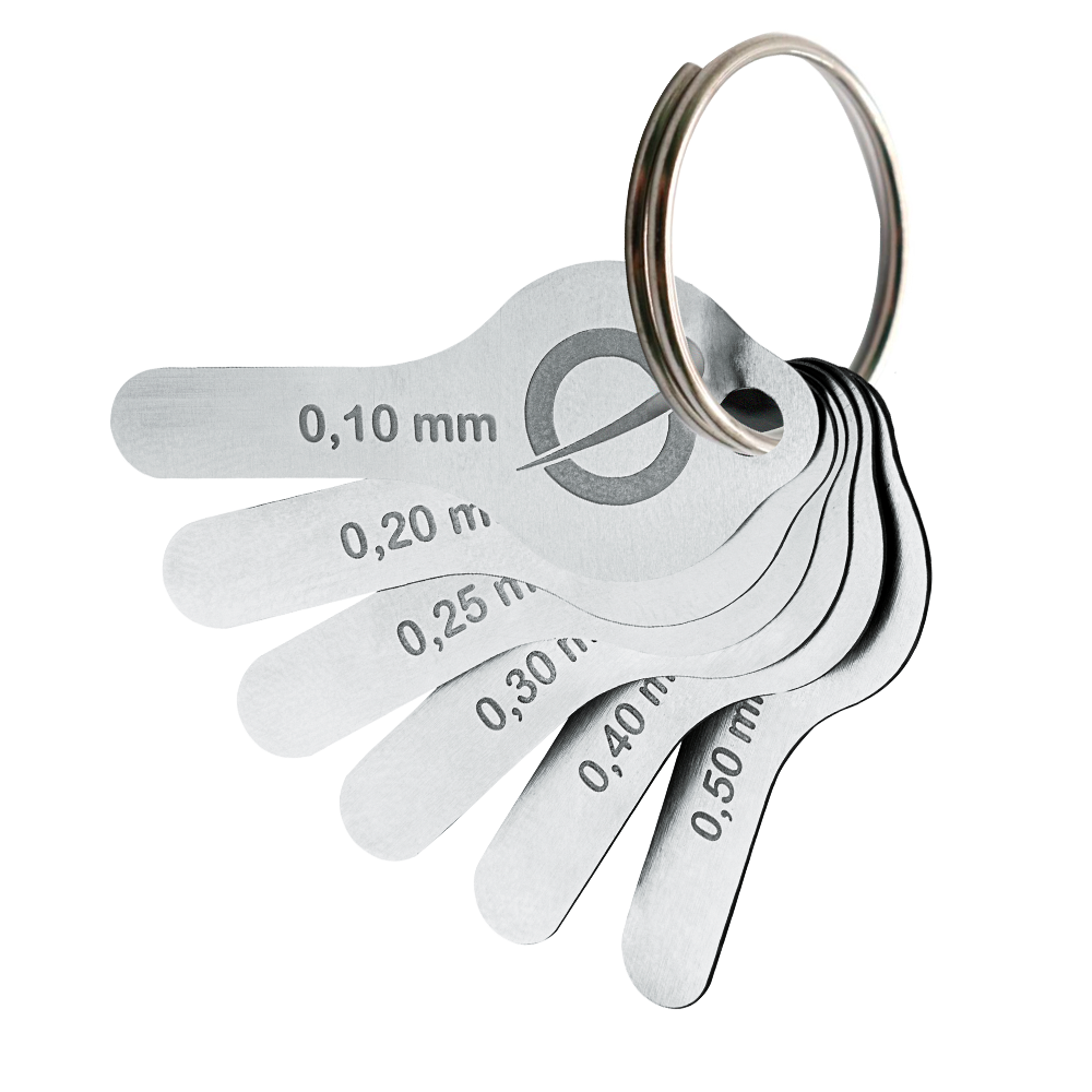 El kit cuenta con 6 hojas de acero inoxidable de diferentes espesores: 0,10 mm, 0,20 mm, 0,25 mm, 0,30 mm, 0,40 mm y 0,50 mm.
