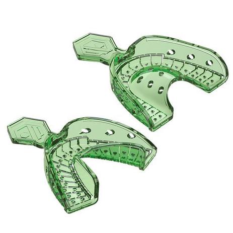 Confeccionada en material termoplástico colorido y transparente, disponible en 3 tamaños: 01 (Pequeño), 02 (Medio) y 03 (Grande), para uso en las arcadas superior e inferior. Posee bordes redondeados y superficie perforada que posibilita la remoción de fracciones de piezas, para impresión con transfer de moldura abierta. Posee canaletas de retención internas y seccionamientos verticales que auxilian en la retención de material utilizado para la impresión. Disponible en paquete de 2 unidades de un mismo tamaño (1 sup y 1 inf)