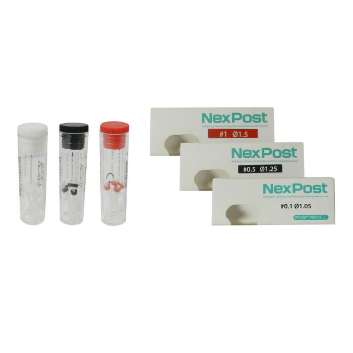 Nexpost, pernos de fibra de vidrio de refuerzo intrarradicular con excelente diseño y caracteristicas mecanicas de modulo elastico y resistencia adecuados para su correcta integracion con la pieza dentaria a reforzar. Radiopacos, disponibles en varios tamaños y kits con sus respectivas fresas de preparacion. Disponible en empaque de 5 unidades (mismo tamaño) o Kit con 15 unidades (5 de cada tamaño) + 3 fresas de preparacion (1 de cada tamaño).